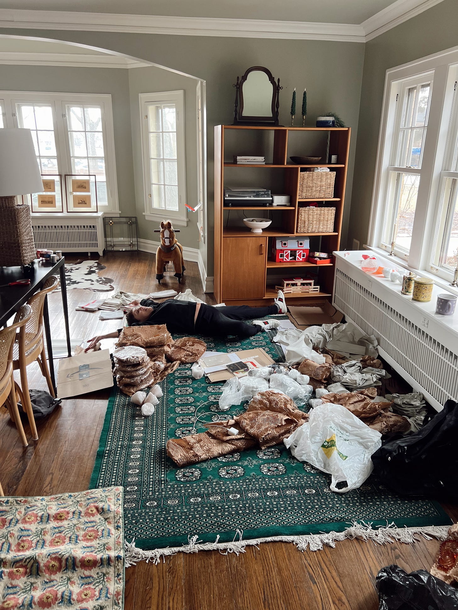 What my living room looked like with Janine (my house manager) and I going through and unpacking everything from my suitcases! 🤣 We only lost one item to breakage (😭💔 a scalloped pink glass dish that I adored, but all in all, I feel like that’s still a win considering how many breakables I had!)